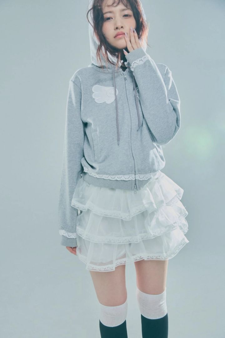 グレーフーディー 8,900円/Tie.Me 白チュールミニスカート 15,180円/lilLilly(lilLilly TOKYO)ブーツ 12,100円/ル デコレ(ル タロン 公式オンラインストア)ニーハイソックス/スタイリスト私物