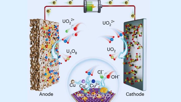 図は、海水に溶けたウランイオン(UO₂²⁺)を“両側から挟み撃ち”で奪い取る様子を描いています。左右に銅製の陽極とチタン製の陰極が向かい合って据え付けられています。スイッチを入れるとまず陰極側で電場が働き、プラスに帯電したウランイオンが磁石に吸い寄せられる鉄粉のようにチタン表面へ集まり、そこで電子を受け取って不溶性の酸化ウラン(UO₂)へ変わって張り付く――これが“直接電気還元”です。同時に陽極の銅はわざと錆びる方向(Cu⁰→Cu⁺→Cu²⁺)にゆっくり酸化され、その途中で生まれるCu⁺がウランイオンと出会うと、電子を譲り渡してUO₂やU₃O₈に変える“間接還元”を引き起こします。つまり陰極は電気でウランを引き寄せて還元し、陽極は自分が酸化されるエネルギーを利用してウランを巻き込みながら沈殿させるという二段構えで、どちらの極にもウランが固体として付着します。酸素発生のような高電圧反応を回避しているため駆動電圧はたった0.6Vで済み、海水中のウランが次々と両極に“吸いつく”ことで溶液側の濃度は急速に下がり、装置全体がまるで低い堤防を越えながら水面を一気に干上がらせるようにウランを抜き取っていきます。/Credit:Yanjing Wang et al . Nature Sustainability (2025)