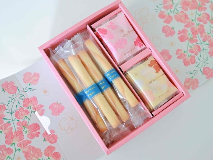 コンパクトなサイズの箱を開けると、ヨックモックの定番人気商品「シガール」と、季節限定のクッキー2種「サブレ フレーズ」「サブレ ミエル アマンド」がきれいに並んでいます。