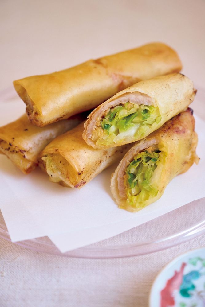 「塩もみしたシャキシャキの春キャベツを、春巻きの皮でたっぷり包んでパリッと揚げます。キャベツの甘みを存分に味わえる、春のごちそうです!」。