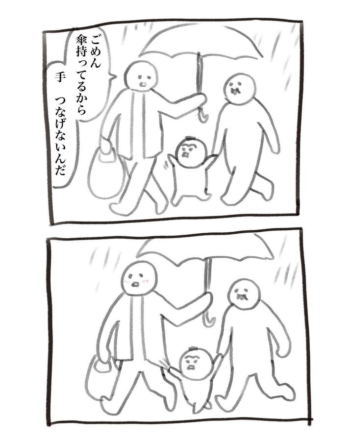 お父さんが買い物袋を持ち、傘をさして歩いています。お子さんと奥さんが雨に濡れないようにという、パパの優しさがうかがえますよね。このとき、息子がパパと手をつなぎたがりますが、パパの手はふさがっています。