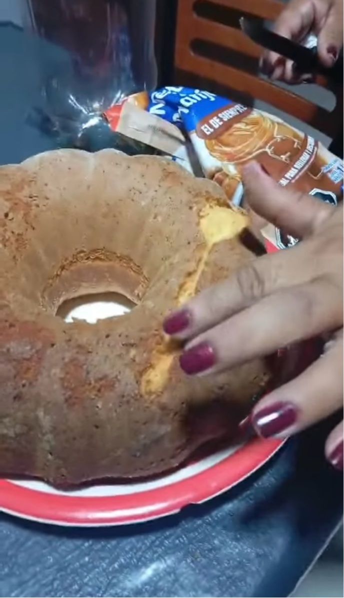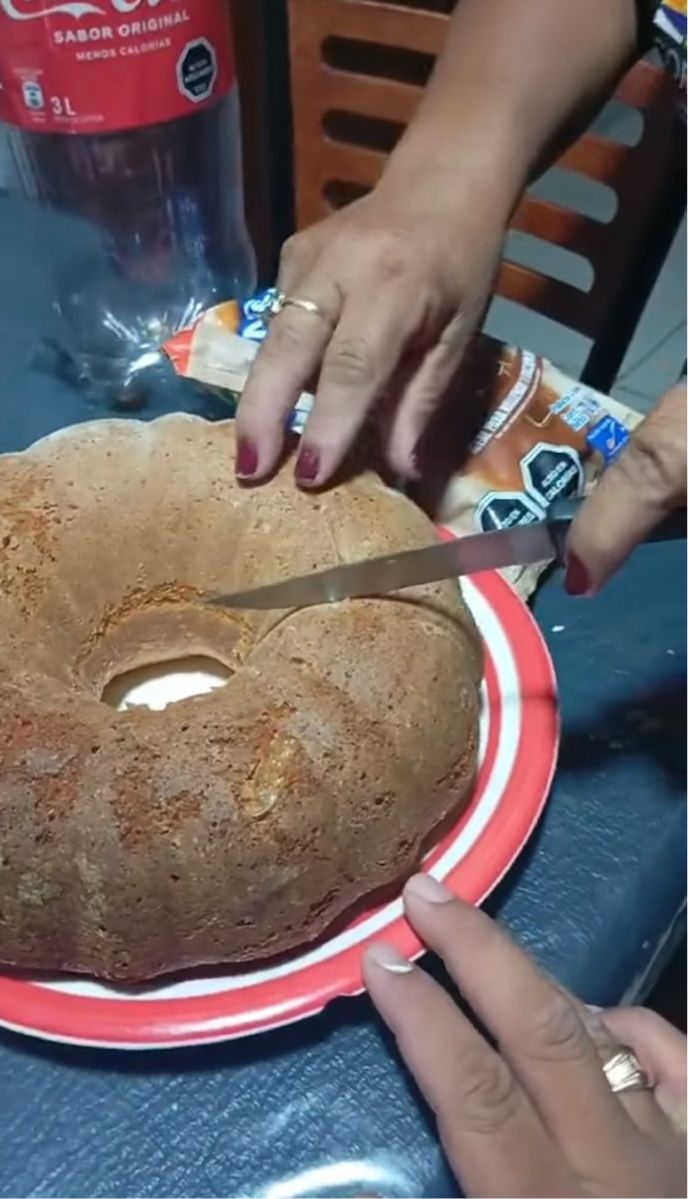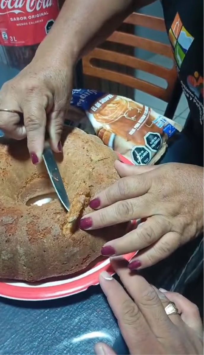 ナイフを手にした女性は、ケーキの表面に何かが埋まっていることに気付きました。 そこで、その場所を発掘してみると・・・