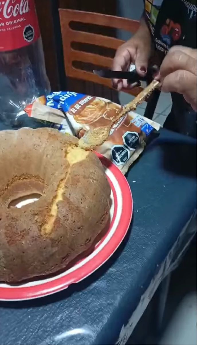 なんと、ケーキの内側からスプーンが姿を現したのです! どうやら、焼く前の工程で間違えてスプーンを生地に紛れ込ませてしまい、そのまま一緒に焼き上げてしまったようです。
