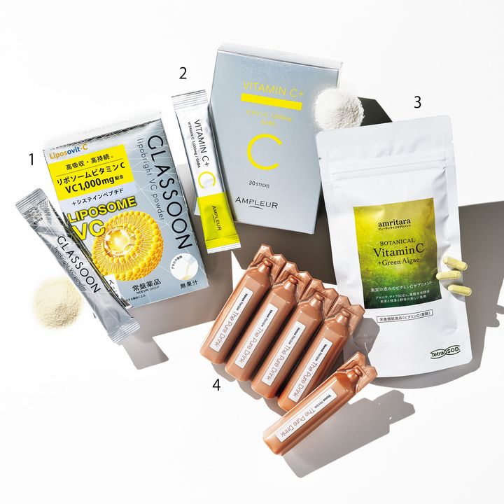 1.グラスーン リポブライト VCパウダー[健康補助食品]14本入り¥3,240(常盤薬品工業)、2.アンプルール ビタミンC+30包入り¥3,996(アンプルール)、3.ボタニカル ビタミンC+グリーンアルジー90粒¥3,996(AMRITARA)4.ヴィーナスレシピ ザ ピュア ドリンク30ml×15本入り¥10,584(アクシージア)
