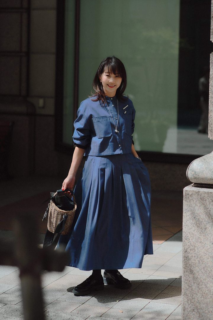 お気に入りのセットアップはデニム生地。50代にも似合う薄手の生地で、大きめのポケットを配したトップスは、ショート丈。セットのスカートは、お腹が目立たないようにギャザーではなく、上部を抑えたプリーツ仕様。せっかくのバランス感、邪魔をしないようシンプルに着こなすために、シルバーのロングネックレスで動きを足しました。カジュアルなデニムのセットアップも、黒小物をところどころに配すると、コーデ全体が引き締まります。50代になり、二の腕や腰回りが少々、ふっくら(笑)してきてピラティスを始めました。ゴルフなど新しいことにも挑戦したいと思っています。