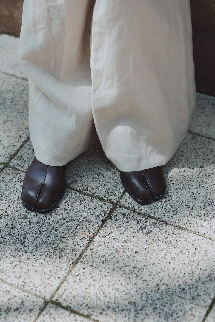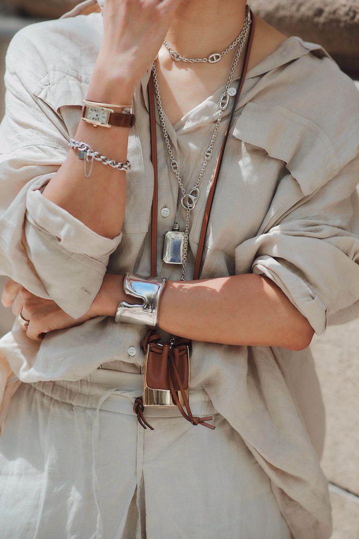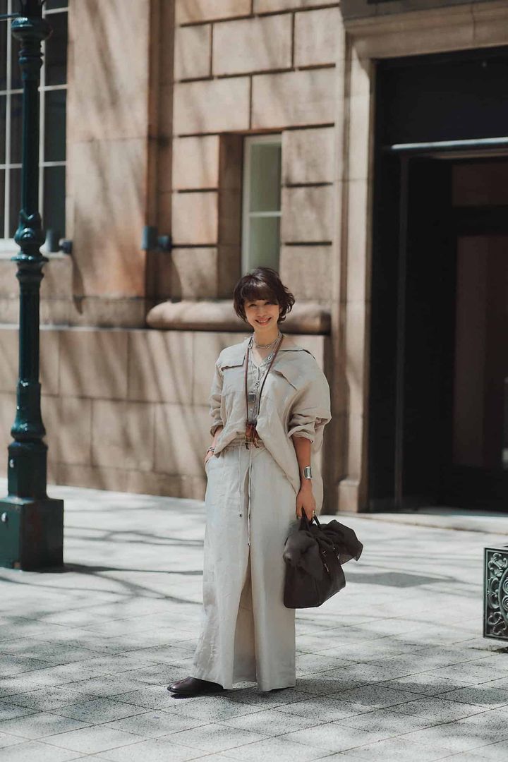 ワントーンに揃えた、リネンのセットアップ。その日の気分でジュエリーを重ねていきます。リネンはナチュラルな素材が醸し出す風合い、シワ感、ラフさが良いですね。優しい雰囲気のまま華やぎを補うために、今日はシルバーを多めに。50代に入ってからは、好きなモノに囲まれた暮らしにシフトしています。心地よいモノ、肌触りのいいモノ、長く愛せるモノを、トレンドよりも「似合う」を重視してコーディネート。ヌーディーな配色には、バッグや、靴、ジュエリーのシルバーやレザーを効かせることがポイントです。