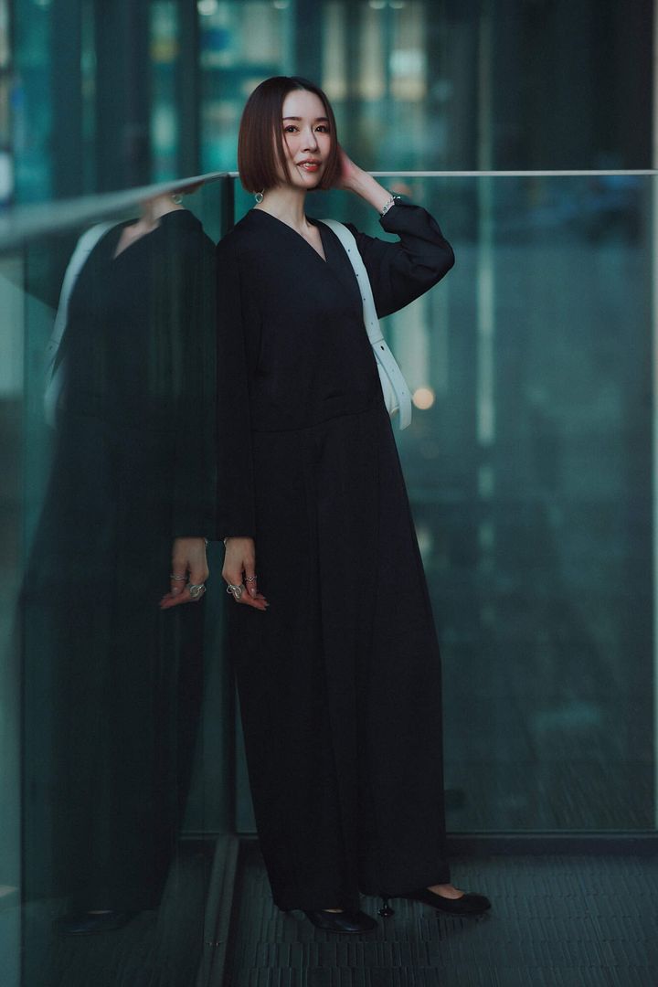 最近届いたばかりの、お待ちかねのオールインワンは、conteのもの。サテンの艶感となめらかな落ち感はしっくりと着こなせる大人のオールインワン。今日は、飾らないシンプルさに、シルバーをプラスしました。深く開いた胸元には、余計なものは加えず、フェイスラインと首元に、ボブからチラっと見えるピアスで動きを出してみました。50代になり、断捨離をしたのをきっかけに、流行や溢れかえる情報に振り回されなくなりました。自分が本当に惹かれるモノ、シンプルなモノで身を包むように。華やかに見せる方法は、飾り立てるだけではなく、削ぎ落したシンプルさの中にもあることに気づきました。オールインワンの黒にシルバーのヒンヤリとした光が、ムードのあるコーデに。