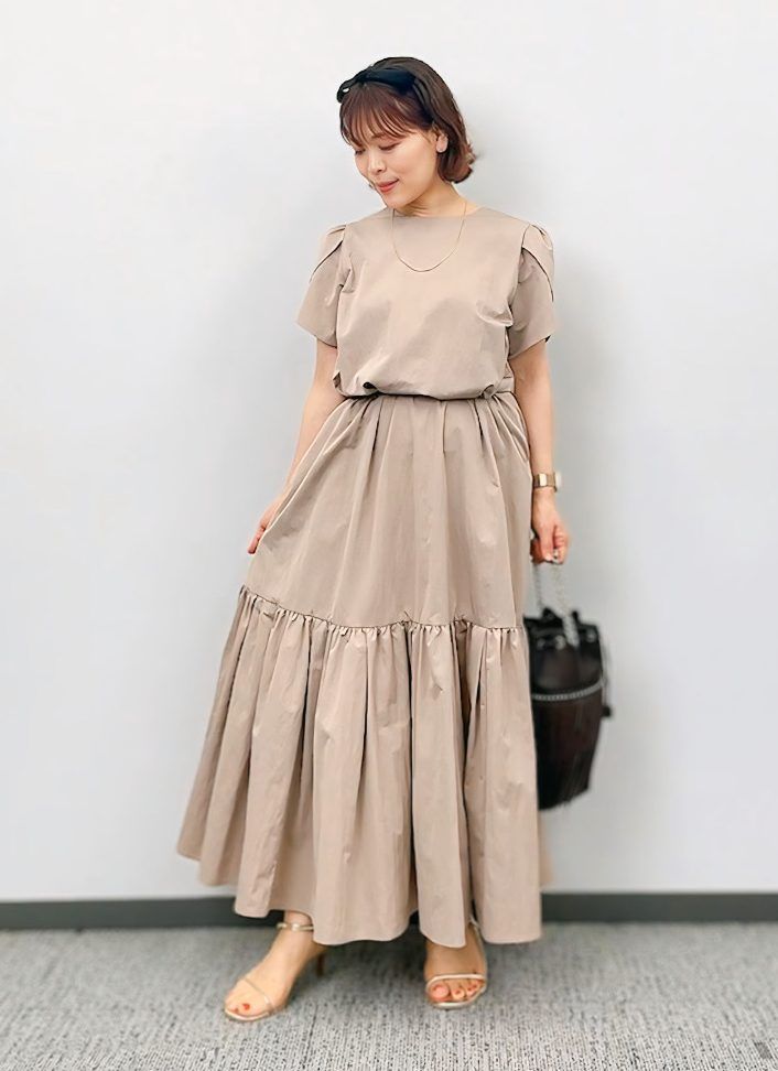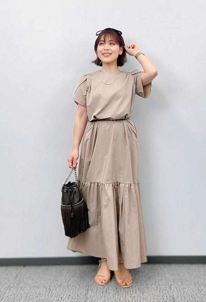 チューリップ袖とギャザーが女性らしいワンピース。撥水加工付きで梅雨や水際シーンでも頼れる1枚です。軽やかなミルクティーカラーが柔らかく、肌なじみも抜群。ゴールドのサンダルとブラウン小物でまとめて、雨の日も上品な装いに整えました。