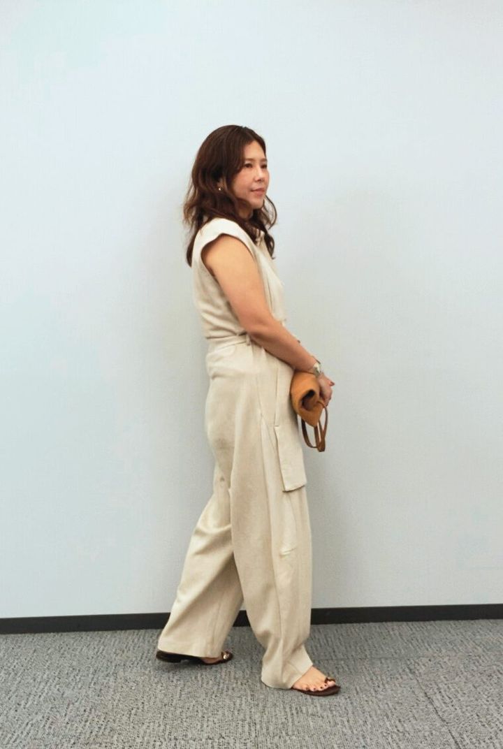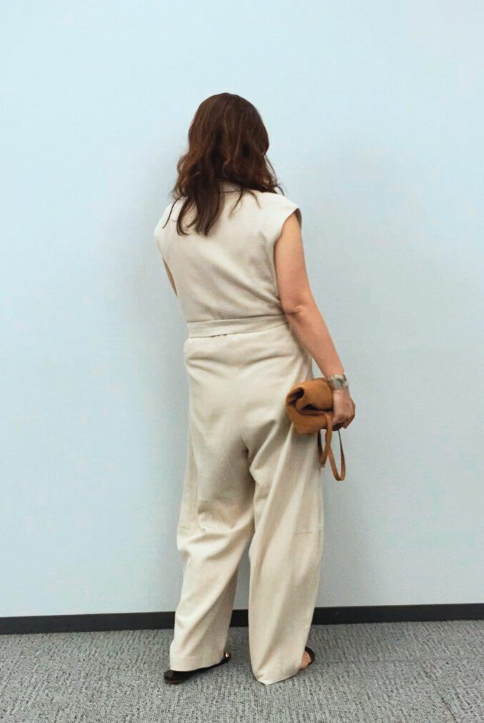 体のラインを拾わないゆったりとしたシルエットと、着脱しやすいフロントジップが魅力のオールインワン。ナチュラルな”きなり色”はブラウン系の小物と好相性。街でもリゾートでも映える一着でシンプルながら洗練された印象のコーディネートです。