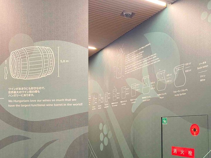 待ち時間には階段横に、店内に入ってからも壁面にハンガリーの歴史や食文化についてのイラスト付きの解説が展示されていて、学びながら知的な時間をすごせます。