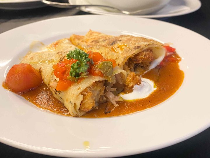 メインディッシュには「ホルトバージ風 肉入りクレープ(鶏肉)」3,280円 を選択。トンカツのように衣を纏って調理された鶏肉が柔らかく、味わい深いです。爽やかさも残しつつ程よくコクのあるソースとクレープ生地と一緒に美味しくいただきました。
