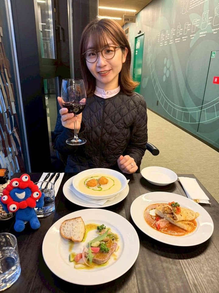 樽感のある赤ワインは、お肉料理によく合う。大阪・関西万博の会場内でこれほどまでに優雅なディナータイムを送れることに驚きました。