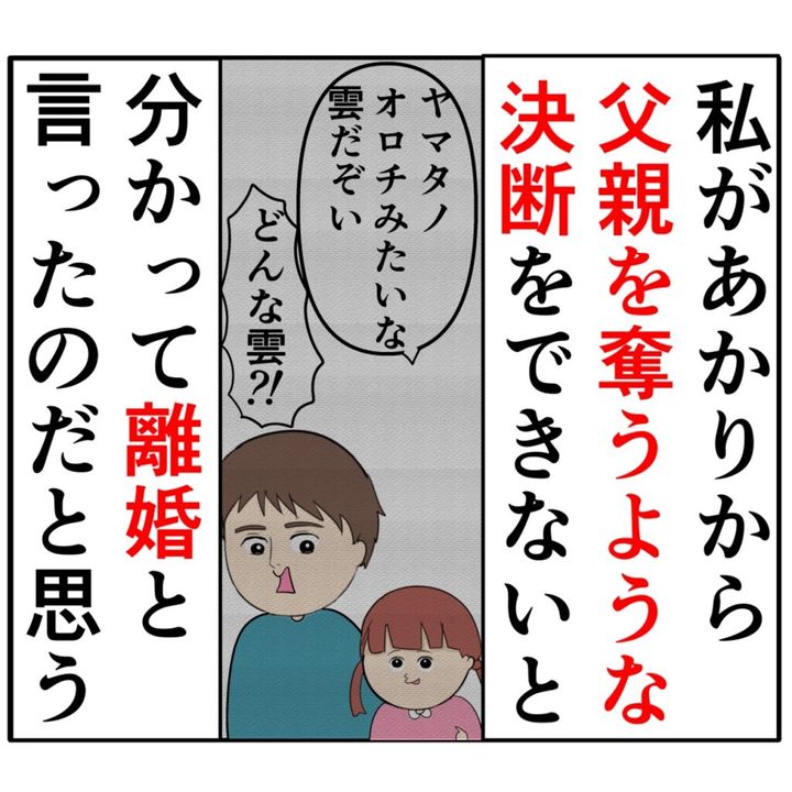 本当は離婚したくないろみ緒さんがなぜ決心して「離婚しよう」と言ったのか、めいさんにはわかっていました。めいさんが娘あかりちゃんから父親をう奪うような決断をすることができずに思い悩む性格だとろみ緒さんにはわかっているから、自分から言ったのです。