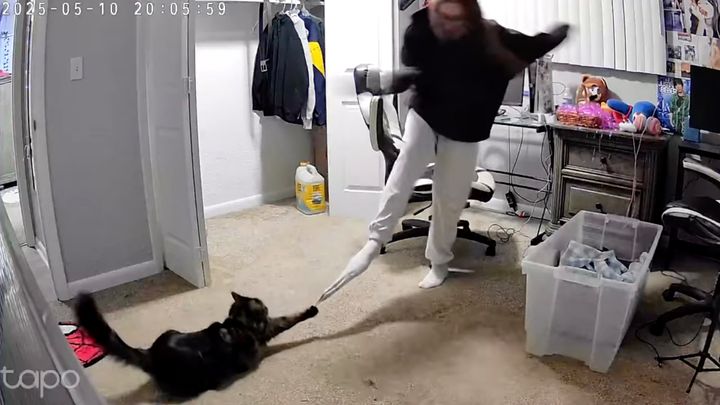 3. 靴下に爪が掛かって混乱した猫、飼い主と共に謎ダンスを舞う