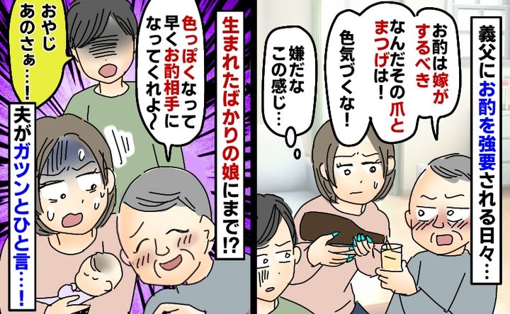 生まれたばかりの娘に義父が「早く色っぽくなってお酌してくれ♡」ゾワッ…!夫がすかさず痛快なひと言