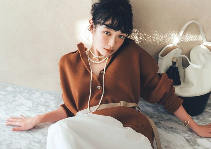 ニット¥8,590/ZARA(ザラ) スカート¥26,400/アンクレイヴ(オンワード樫山) イヤカフ¥6,600/ココシュニック オンキッチュ(ココシュニック) あこやパールネックレス¥99,000/Elena Jewery、2連にしたパールネックレス¥35,200/Pearl for Life、バングル¥110,000/スキャット(以上ロードス) チョーカー¥58,300/ALT(H.P.FRANCE) ベルト¥13,200/レフィエ(フラッパーズ) バッグ¥165,000、チャーム¥35,200/ともにJ&Mデヴィッドソン ローファー¥42,900/カステラーノ(フラッパーズ)