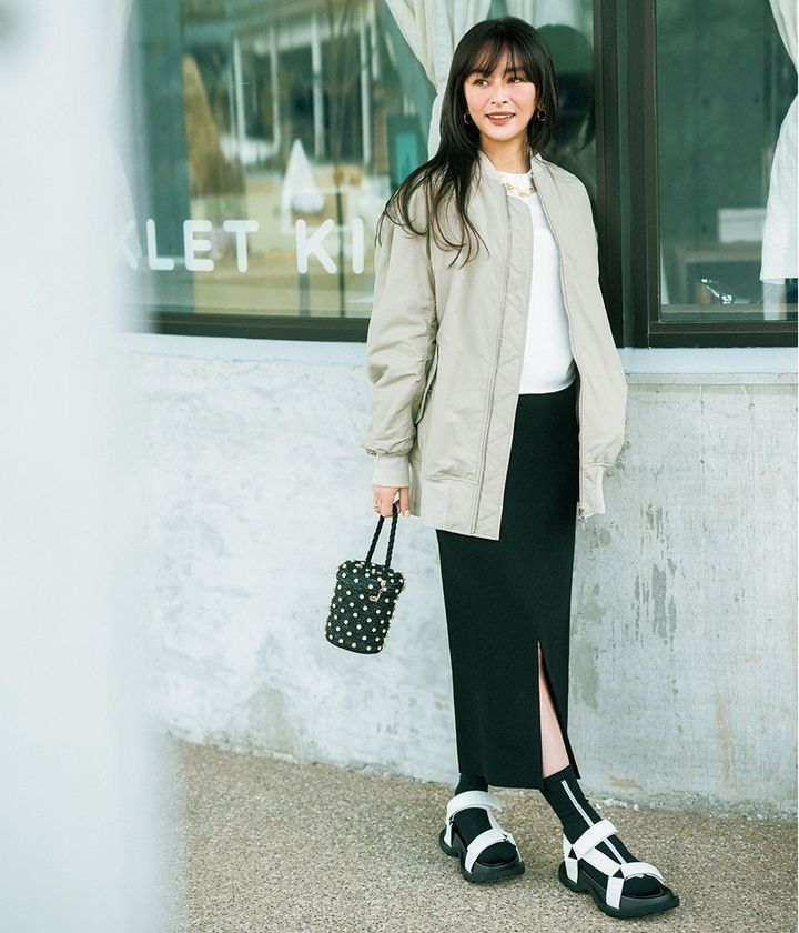 ロゴリブソックス¥3,300(FAKUI/ル タロン グリーズ ルミネ新宿店)スポサン¥49,500(サクラ/インターリブ)MA-1ブルゾン¥47,300(ウィム ガゼット/ウィム ガゼット 玉川髙島屋 S・C店)スウェトトップス¥6,990(アンフィーロ)タイトスカート¥28,600(RHC/RHC ロンハーマン)かごバッグ¥117,700(ルナイン/ルル・ウィルビー/アルアバイル)フープピアス¥35,200リング¥24,200(ともにプラウ)チェーンネックレス¥106,700ハートネックレス¥28,600(ともにシャーロット ウーニング/フラッパーズ)