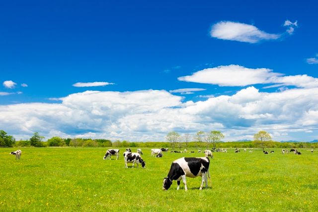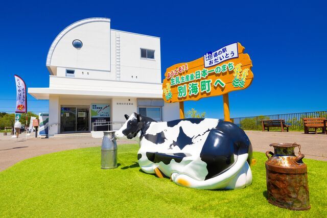 人口の7倍近くの牛が町内で飼育されており、生乳生産量日本一の酪王王国「別海町」。夏季には、道の駅の広場にも、牛のベンチや牧草ロールが設置され、撮影スポットとしても人気なのだそうです。