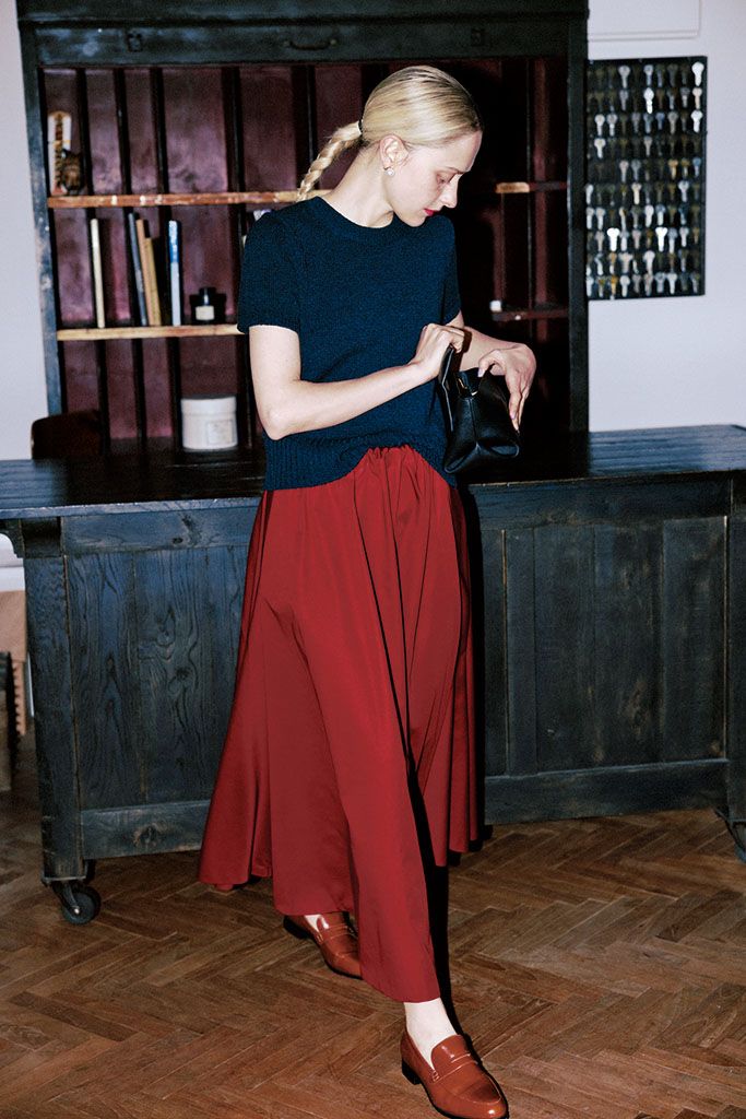 【POINT】ハリのある赤スカートを日常に引き寄せる、深みのあるネイビーニット。ボリューミィなスカートに、冷たいダークカラーを効かせることでメリハリがつく効果も。