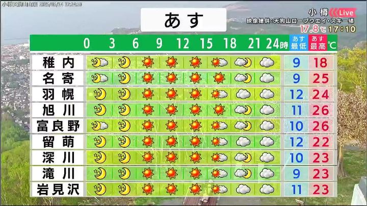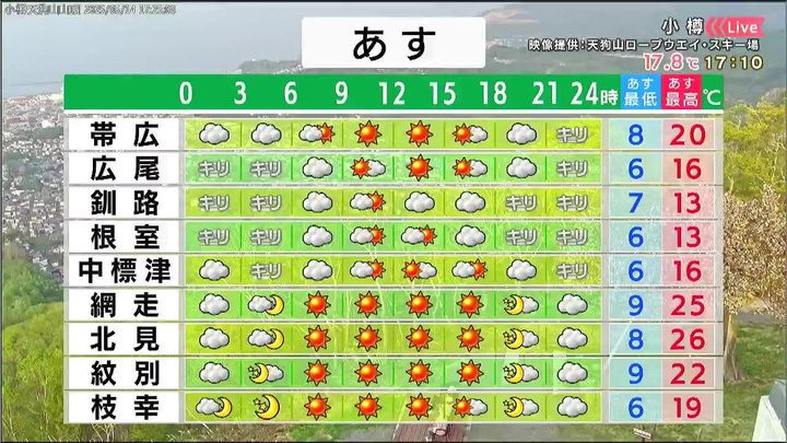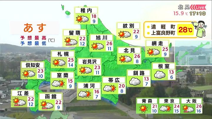 日本海側やオホーツク海側は晴れて、暑くなります。札幌と網走でも25度、旭川と北見は26度、オホーツクの遠軽町や上富良野町は28度でしょう。一方、太平洋側は雲が広がり、釧路や根室は13度などヒンヤリします。