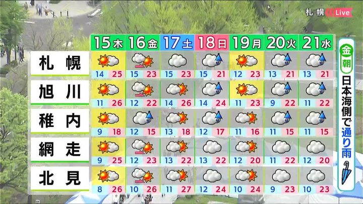 金曜の朝は日本海側で雨が降り、札幌もぱらつく可能性があります。金曜の午後から土曜は日差しが出ますが、日曜日以降は日本海側で雨の降る日があるでしょう。