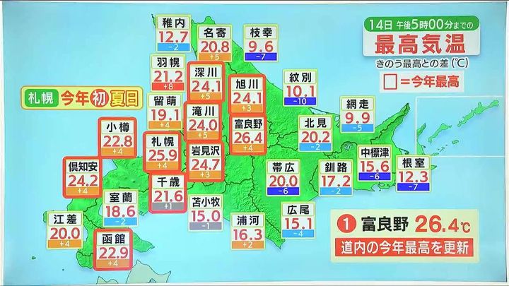 きょう14日(水)も気温が上がり、日本海側で赤枠、今年一番の暑さになりました。札幌は25.9度まで上がり、今年初めての25度以上の夏日に、富良野は26.4度で、道内の今年の最高気温を更新しました。一方、オホーツク海側は空気ヒンヤリ。紋別や網走は10度くらいでした。