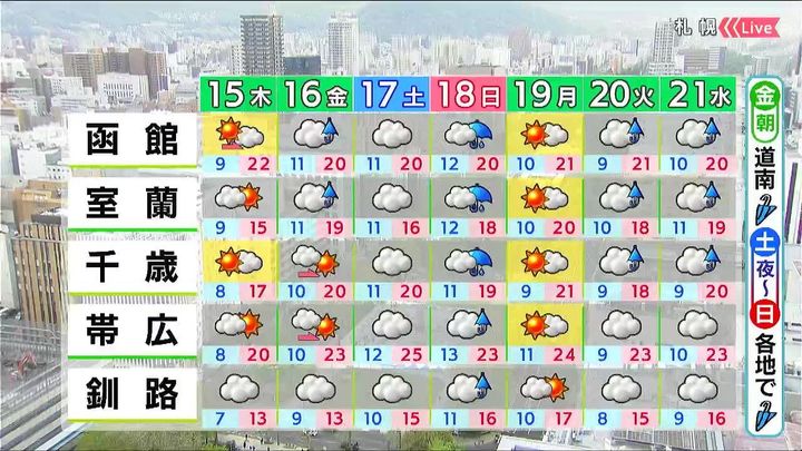 あす15日(木)の時間ごとの天気。道央・道南からです。