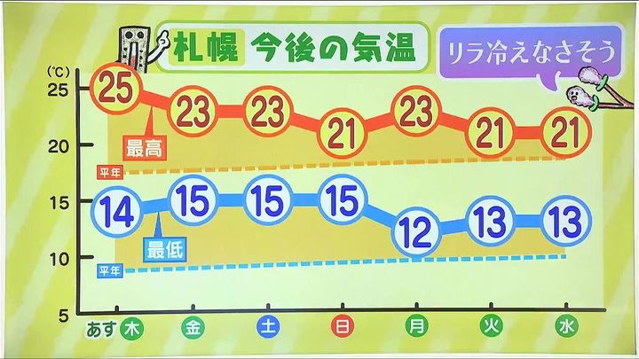 この先の札幌の今後の気温変化を見ても、来週にかけてリラ冷えはなさそうです。平年より高く、最高気温は連日20度を超え、屋外でも過ごしやすい気温です。最低気温は15度くらいで、6月並みでしょう。