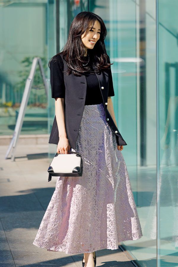 あえてシックな色と掛け合わせて都会的に着こなすのが、この春のイチオシ。小物も黒でまとめると、スカートの華やぎがより印象的に。