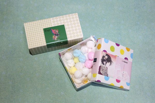 「浮世絵現代」のオリジナルグッズ、レインボーラムネ(648円)、つじりの里(700円)は出品作品からデザインされたパッケージがおしゃれです。