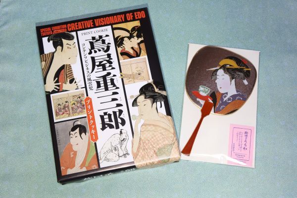 特別展「蔦屋重三郎 コンテンツビジネスの風雲児」のオリジナルグッズは、同展のプリントクッキー(864円)、喜多川歌麿《難波屋おきた》の図柄の通信うちわ(660円)を購入。プリントクッキーは8種類の浮世絵の絵柄が入っています。