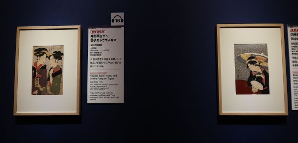 左は大阪の芸者と仲居を描いた同じ栄松斎長喜筆の重要文化財《井筒中居かん 芸子あふきやふせや(いづつなかいかん げいこおうぎやふせや)》。江戸とは異なる大阪の風俗を描き分けています。