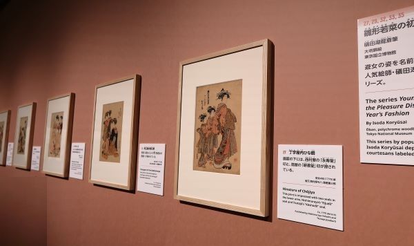 右、《雛形若菜の初模様 丁字屋内ひな鶴》 礒田湖龍斎筆 1枚 安永4年(1775)頃、ほか展示風景 東京国立博物館蔵 前期展示:4月22日(火)~5月18日(日)※後期展示:5月20日(火)~6月15日(日)「雛形若菜の初模様」のうちで展示替あり