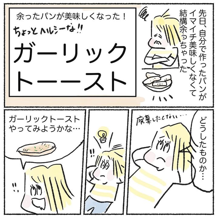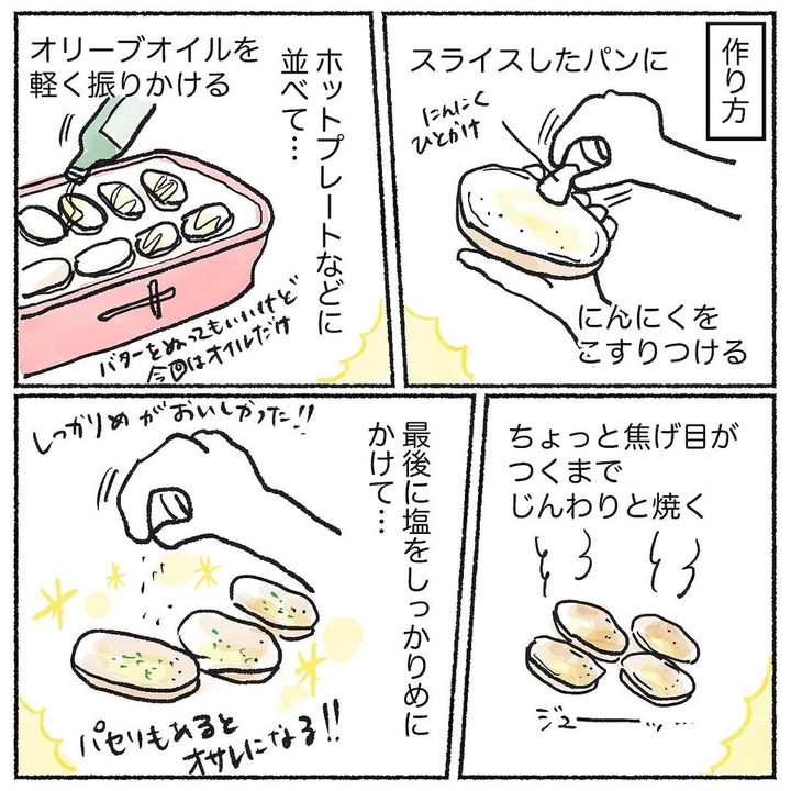 3. 【余ったパン救済】オリーブオイルで「ガーリックトースト」作ってみた!にんにくは“こする”だけ【Ayumiの漫画】