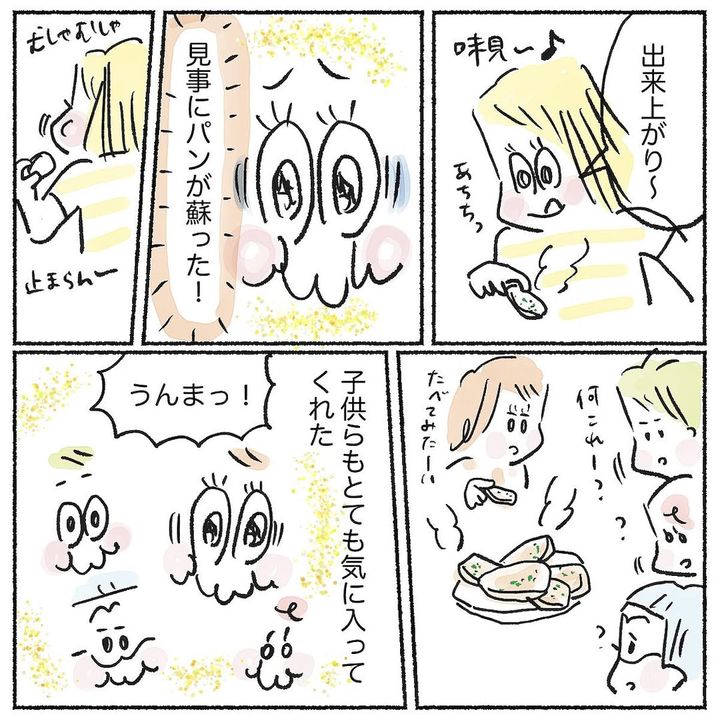 こんにちは!4児の母で漫画家兼公認会計士のAyumiです。たまにパンを自家製するんですが、味がいまいちで余ることが…(泣)。どうにかおいしく食べ切りたいってことで、救済レシピを考案しました!にんにくをこすりつけたパンに、オリーブオイルを回しかけたら、後は焼くだけ。最後に塩をしっかりめにかけるのがポイントです。バターが無くても大満足に仕上がるはず♪詳しくは、漫画をご覧ください!