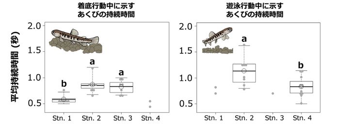 左:着底中のあくびの長さ、右:遊泳中のあくびの長さ/ Credit: 北海道大学(2025)