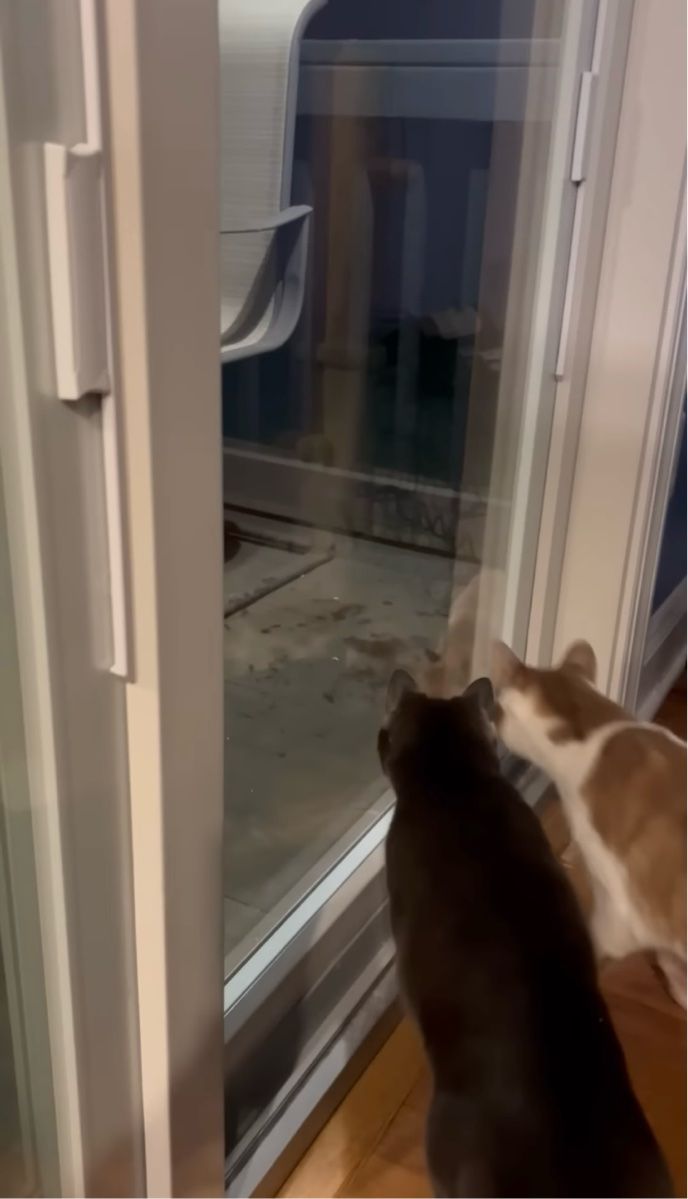 3. 「誰か来たね」窓辺でザワつくネコたち。窓の外までやって来たお客さんもネコたちを見てビックリ!?【アメリカ・動画】