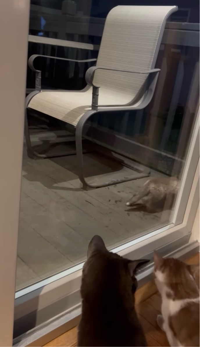 アメリカのとあるお宅で撮影されたこちらの動画には、愛猫たちをザワつかせたあるお客さんの姿がキャッチされていました。