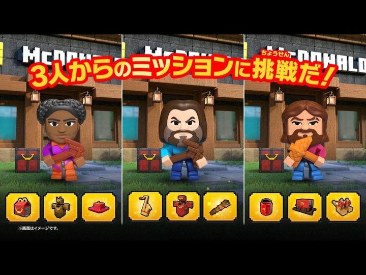 マインクラフトの世界でスティーブ、ギャレット、ドーンの3人からミッションを与えられ、時間内に素材をたくさん集めて組み立てるゲームは「フライド・ラッパ」「鎧金のスマイルのよろい」「マクドナルドブーツ」などのオリジナルアイテムを作るというもの。