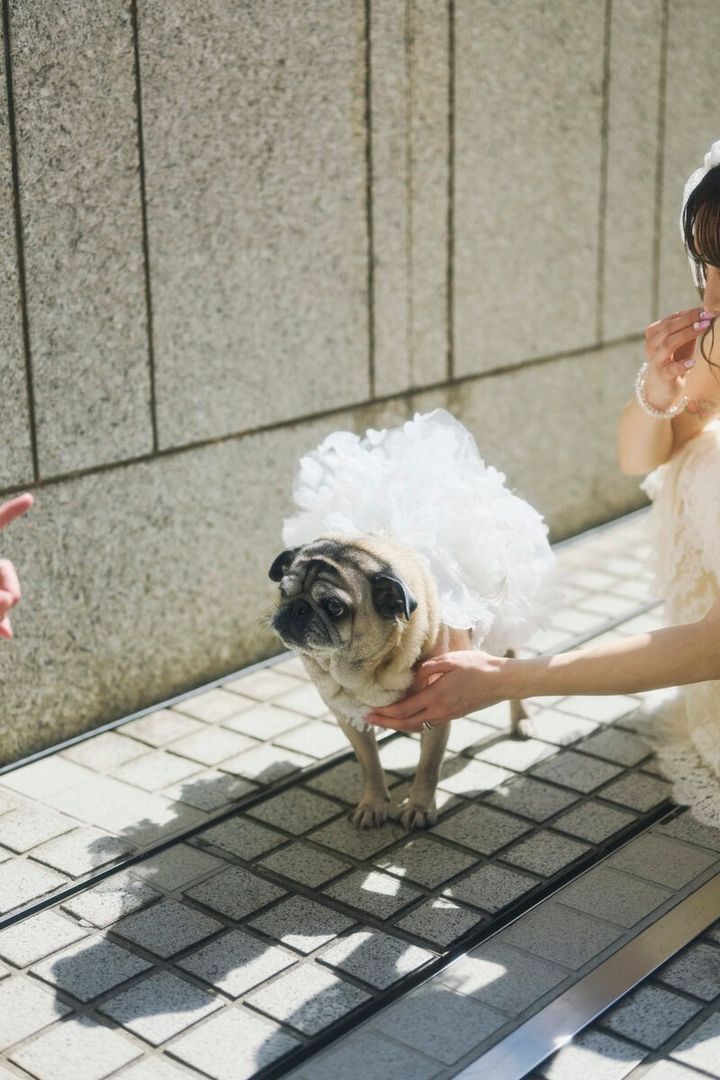 ウェディングらしさのある白ドレス&スーツだけど、足もとはおそろいのナイキスニーカー。サグワくんのキャップにこめられた「I LOVE YOU」が洒落てます! 愛犬・ふくちゃんも白ドレスに身を包んで♡ きゃわわ!