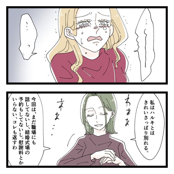 セリナが何も言えないまま涙を流していると、「私はハルキとはきれいさっぱり別れる。今回は、まだ職場にも話してないし、結婚式場の予約もしてないし。慰謝料とかいらい、コレも返すわ」そう言って指輪をはずすと、