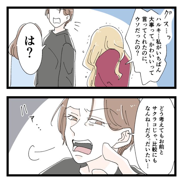 「ぐすっ・・ハルキ・・私がいちばん大事って。かわいいって言ってくれたのに、ウソだったの?」セリナが泣きながらそう言うと、「どう考えてもお前とサクラコじゃ、比較にもなんねーだろ。だいたい・・」呆れたようにため息をつきながらそう言うハルキに、