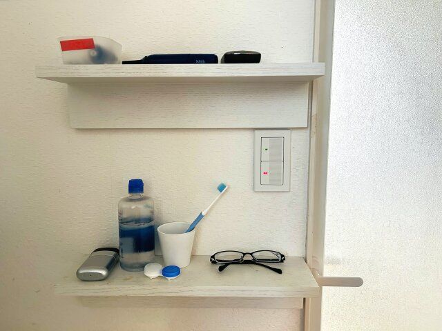 筆者宅は、洗面台に散らかりがちな子どものコンタクト用品やケア用品の定位置として取りつけています。
