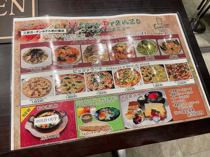 三井ガーデンホテル柏の葉1階にある、コメ・スタさん。 平日ランチでは、メインをパスタかピッツァから選べて、価格は1,700円から。 柏の葉キャンパス駅周辺の他のお店と比べるとお高めではありますが、ホテルのレストランであり、サラダ、ドリンクバーもついていると思うと、たまの贅沢には納得のお値段です。