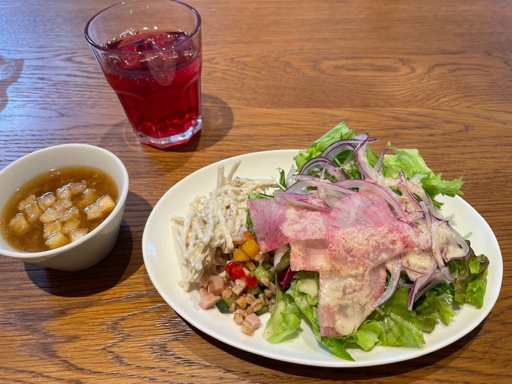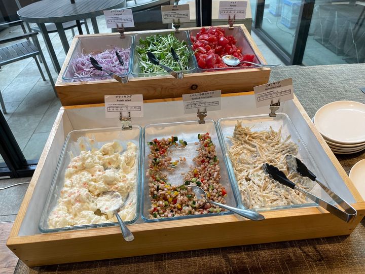 トマトや玉ねぎに加えて、惣菜系のサラダもあります。