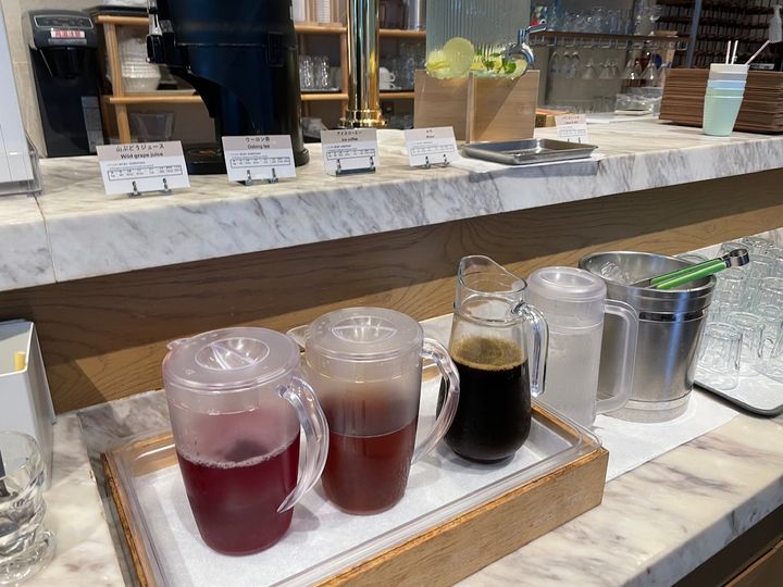 また、ランチタイムはドリンクもついてきます。 カウンターに置かれてあるので、好きなものを自分で注ぐスタイル。 山ぶどうジュースが置かれているのが珍しいですね。