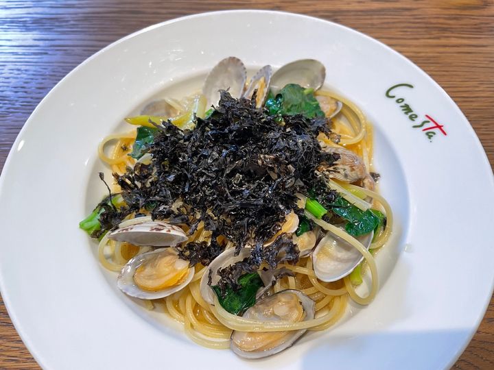 個人的にコメ・スタさんのパスタは、特に海鮮系のものが好きなので、こちらをチョイス。 アサリと海苔がたっぷり乗っていて、アサリはしっかり大きいんですよね。