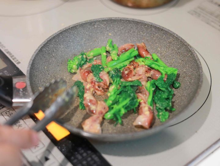 料理のコツは火を入れすぎないこと。ホタルイカの耳がピンと立てば火入れはOKです。独特の風味を持つ菜の花ですが、味噌漬けされたホタルイカと調和して、バランスのいい味わいに。見た目も鮮やかに食卓を彩ります。