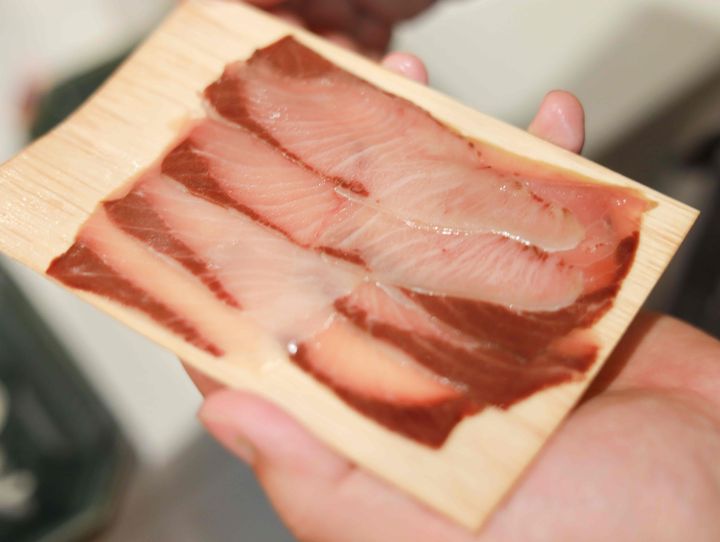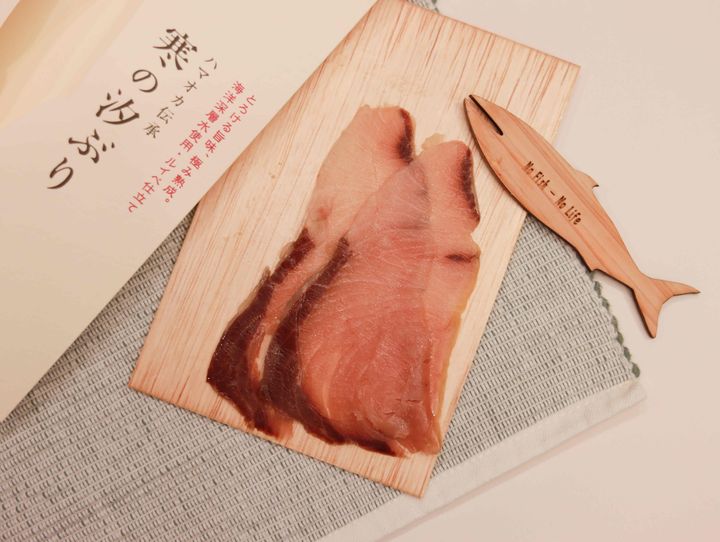“ぶりの生ハム”とも呼ばれる汐ぶりのスライスは、付属の魚型ヘラを使えば、1枚ずつ簡単かつきれいにすくい取ることができます。また、控えめにあしらわれたメッセージに思わず笑みがこぼれました。食べ終わった後も、残しておきたくなるような可愛らしさです。