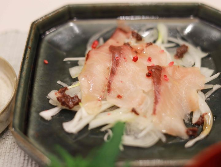 薄くスライスした新玉ねぎの上に汐ぶりをのせ、仕上げにオリーブオイルをひとかけ。ピンクペッパーを添えて、カルパッチョ風に仕上げました。ぶりの深い旨みがそれぞれの素材をまとめあげる、富山を感じる新しいおつまみを味わいました。